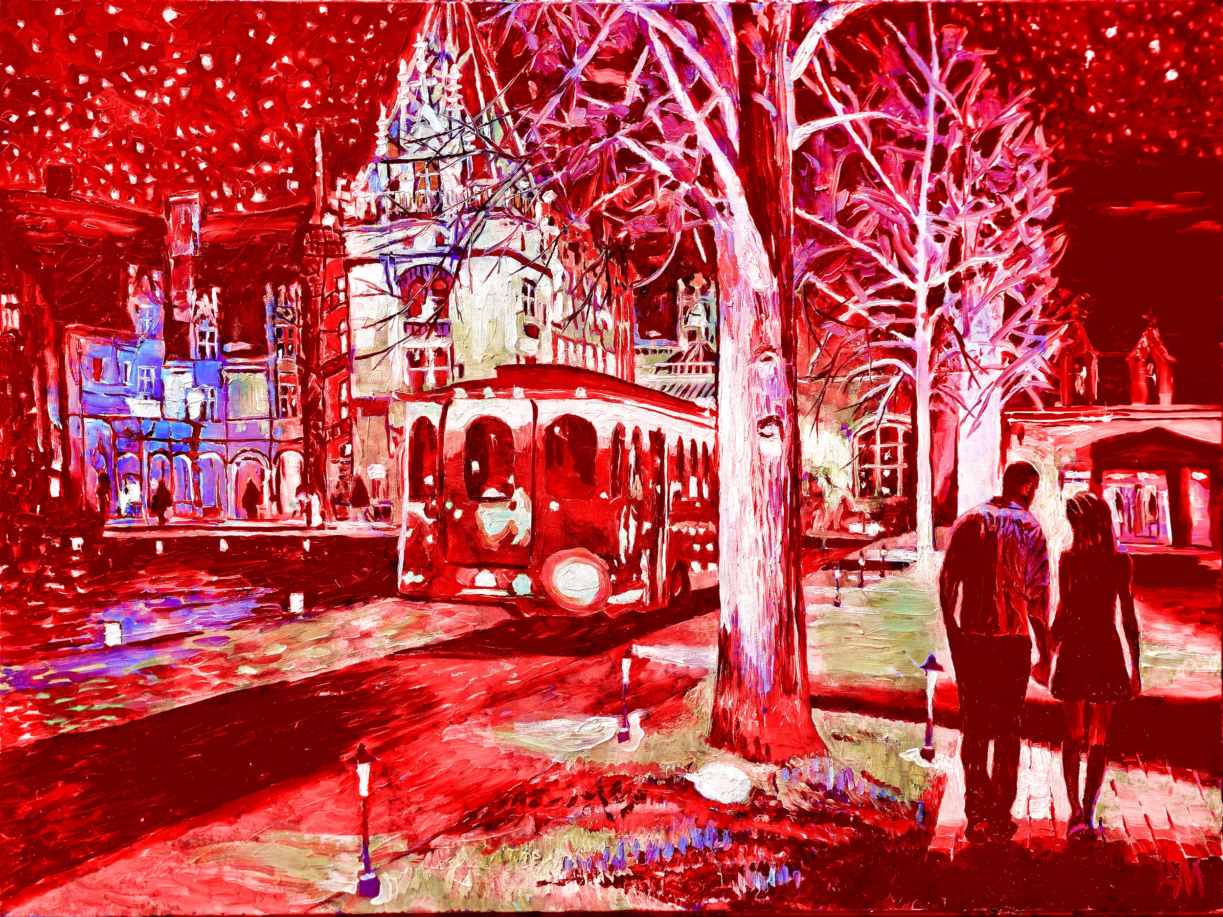 This is a Print Edition in Red of Robert Mihaly’s original oil painting Biltmore at Night, 2024, capturing the estate?s towers, glowing trolley, and a hand-in-hand couple beneath a fiery red sky, where light, shadow, and passion converge in a moment of nocturnal magic.