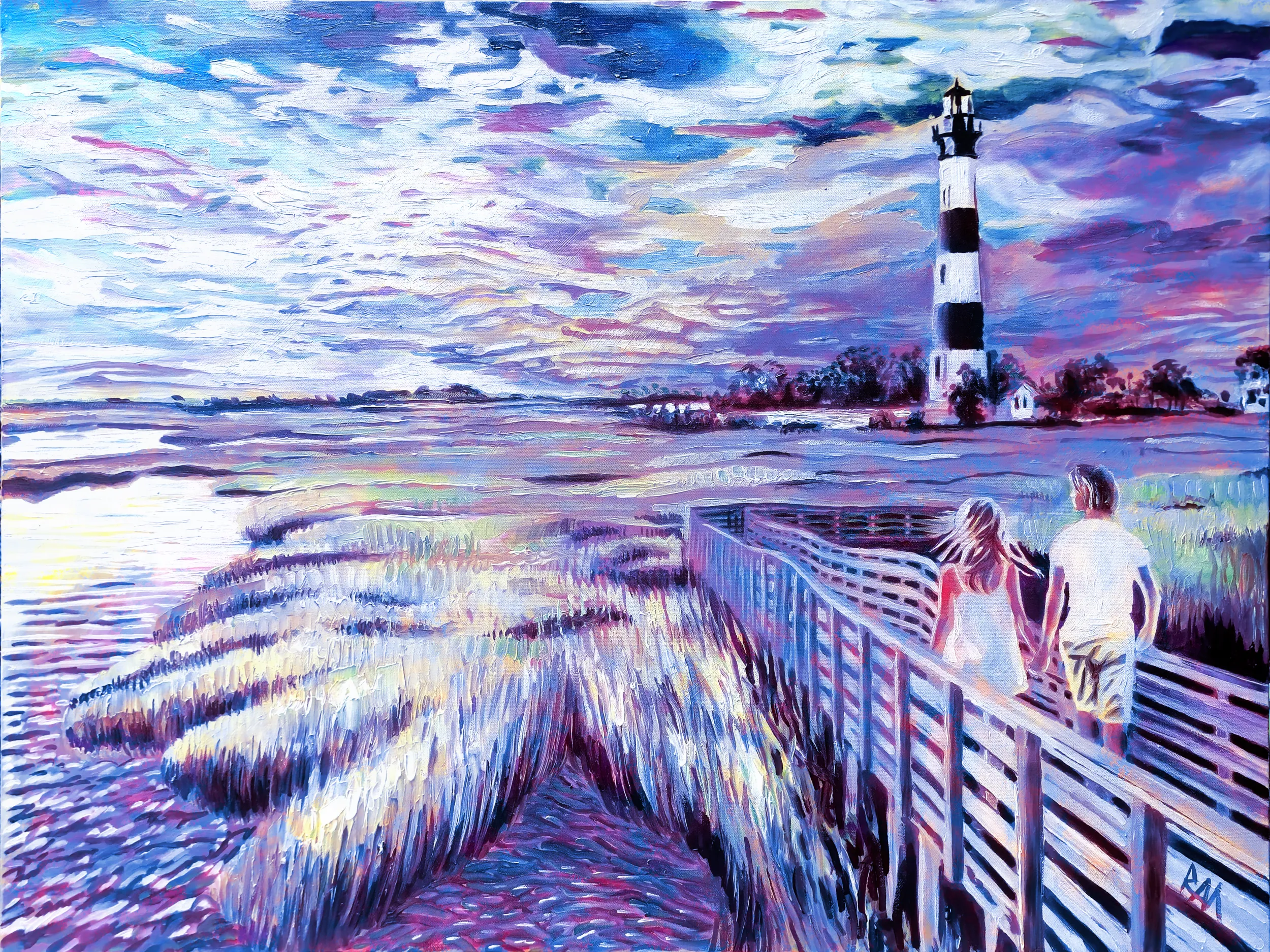 This Artwork in Blue invites the viewer to linger in its contemplative beauty. The bold impressionistic brushwork, the luminous cool palette, and the poetic interplay of natural light and shadow transform Bodie Island Lighthouse into a serene, dreamlike place where human presence, history, and nature exist in gentle harmony.