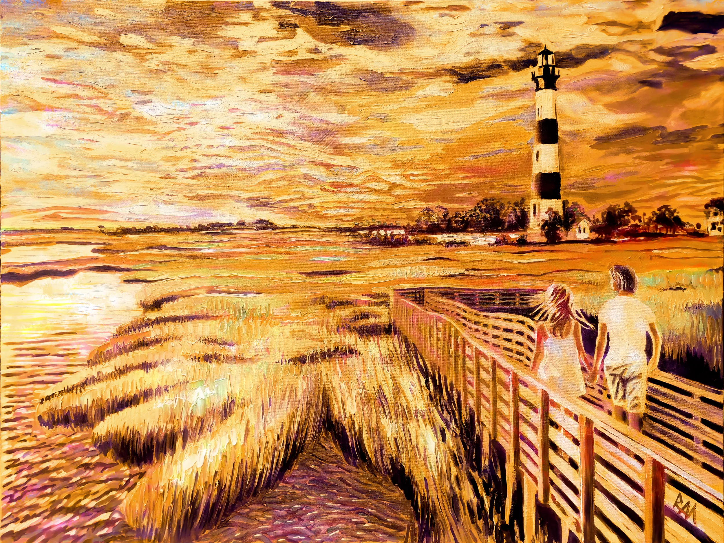 Rendered in rich, earthy browns, this edition of Bodie Island Lighthouse evokes warmth, history, and quiet reflection. Mihaly?s bold, impressionistic brushwork brings the marsh, boardwalk, and sky to life in a spectrum of sepia tones, capturing the tactile beauty of nature and the subtle interplay of light and shadow. The soft gradations of brown suggest sun-warmed wood, rustling grasses, and the enduring presence of the lighthouse, grounding the scene in a timeless, almost nostalgic atmosphere.