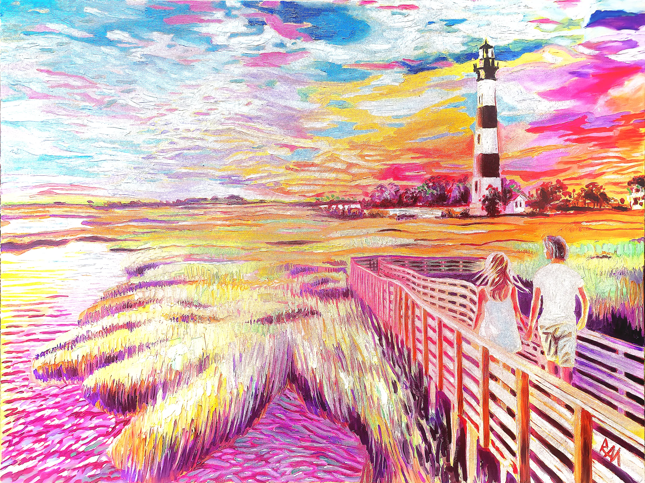 This Artwork in Pastel Colors celebrates serenity, romance, and the profound beauty of the North Carolina coast. It invites viewers into a world where the sky unfurls like a painted dream, where the lighthouse stands watch over shifting tides and tender moments, and where two figures walking together become part of a story shaped by color, light, and the gentle magic of the marsh.