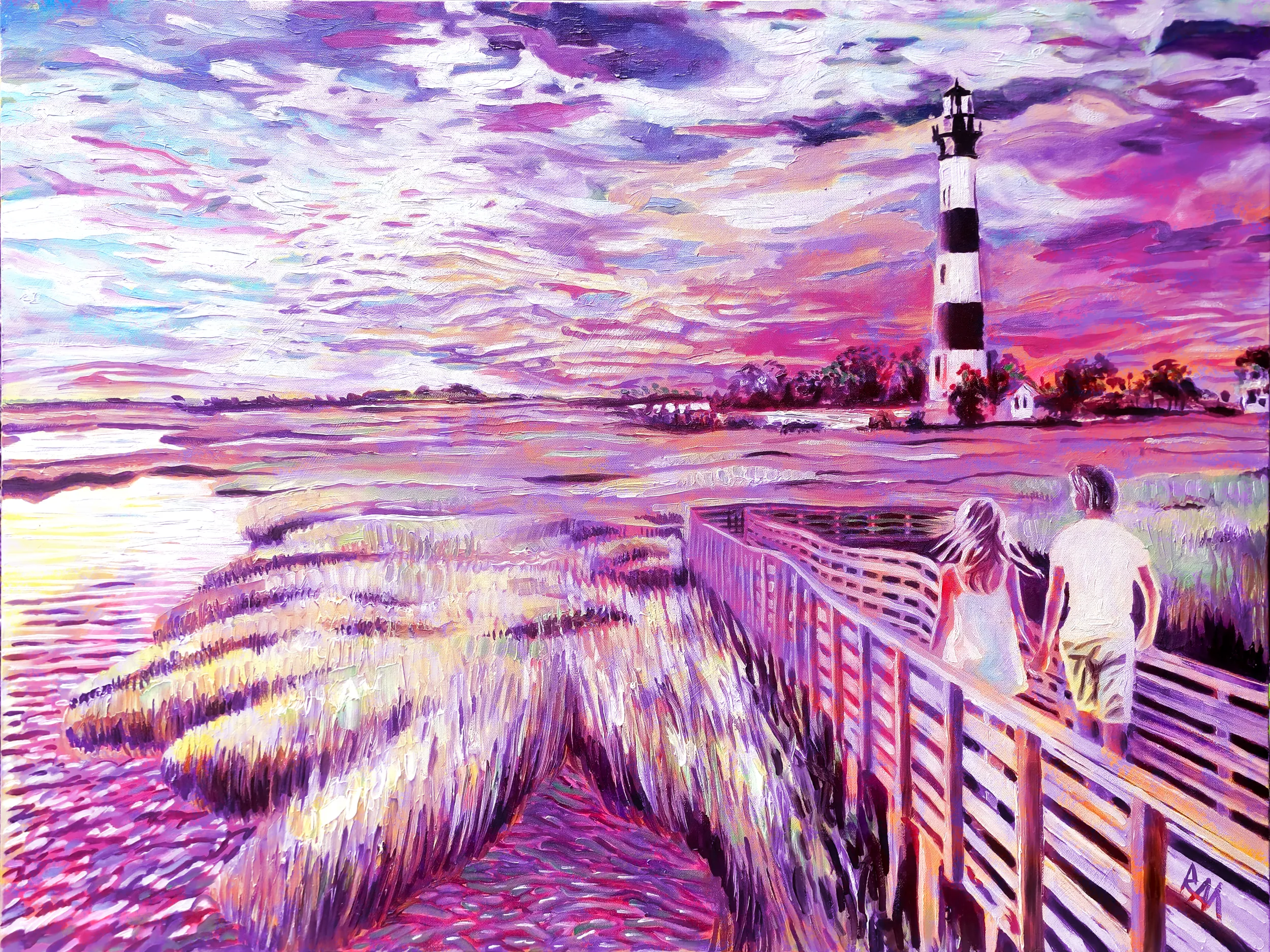 On the raised wooden walkway above the marsh, a couple strolls hand in hand, their figures tenderly outlined against the purple haze of sky and land. The soft violet light seems to caress them, lending an ethereal quality to their steps, as if they are moving through a shared dream. The marsh itself shimmers in a tapestry of purples, muted greens, and silvery undertones, reflecting the diffused light in gentle, rhythmical patterns. The wooden planks beneath their feet catch fleeting glimmers of lavender and deep iris, guiding them toward the steadfast lighthouse ahead.