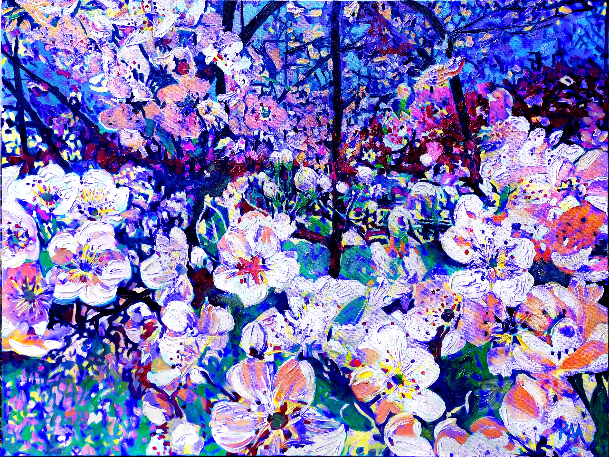 Hints of warm underpainting?golden ochres, faint magentas, soft greens?peek through beneath the layers, amplifying the brilliance of the blues and giving the composition a multidimensional glow. The blossoms themselves oscillate between realism and abstraction: one moment recognizable as petals and stamens, the next dissolving into fractals of color and radiance. This edition turns a humble spring bloom into a sensory spectacle, celebrating both the poetry of nature and the exhilarating possibilities of color.