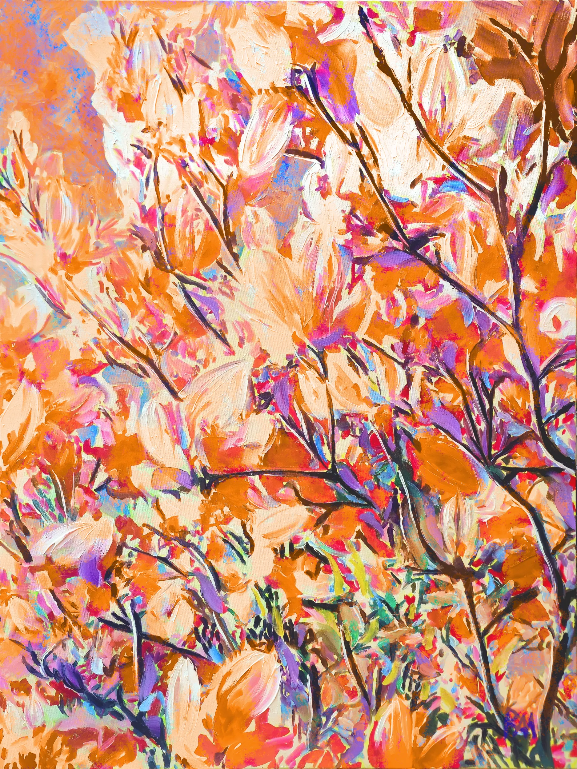 In this vibrant edition, Mihaly transforms the delicate Bradford pear blossoms into a kaleidoscopic celebration of orange hues, igniting the composition with warmth, energy, and visual intensity. Petals burst with shades ranging from tangerine and coral to burnt sienna and deep pumpkin, layered in intricate patterns that convey both motion and exuberance. Branches, brushed in rich amber and cinnamon tones, weave through the composition, grounding the fiery blooms while accentuating their radiant vibrancy. Each cluster of blossoms seems to pulse with life, as if the energy of spring itself has been distilled into this luminous, dynamic arrangement.
