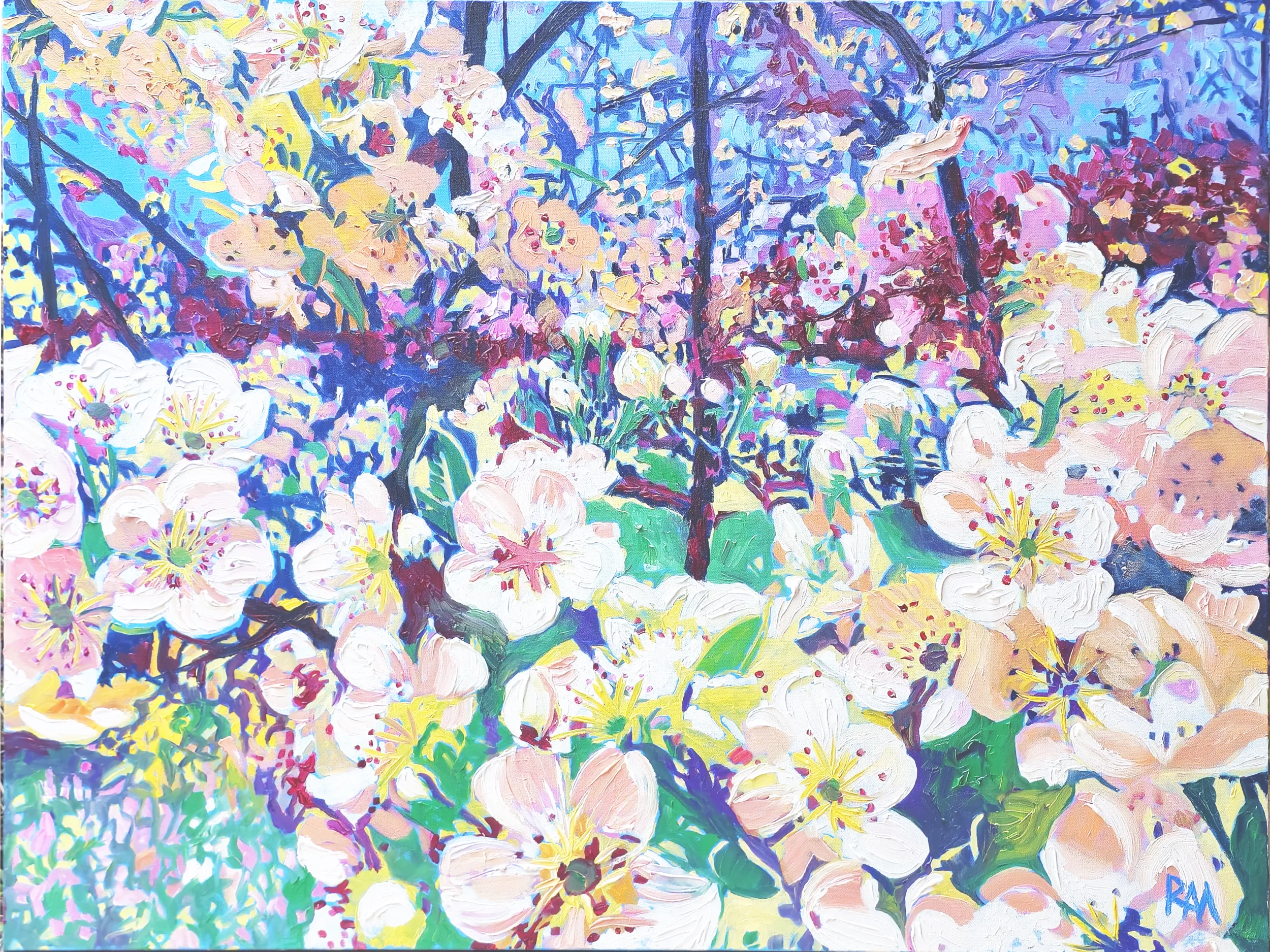Mihaly?s brushwork emphasizes subtlety, layering soft pigments to create depth and motion within the composition. Shadows are barely perceptible, allowing the pastel tones to glow with a quiet radiance, while highlights pick out the delicate edges of petals, lending a sense of tactile dimension. Negative spaces are infused with whispers of soft aqua, cream, and blush, giving the painting an airy, luminous quality. The kaleidoscopic arrangement of overlapping blossoms evokes both the energy of springtime growth and a meditative calm, inviting viewers to linger over each intricate cluster of flowers.