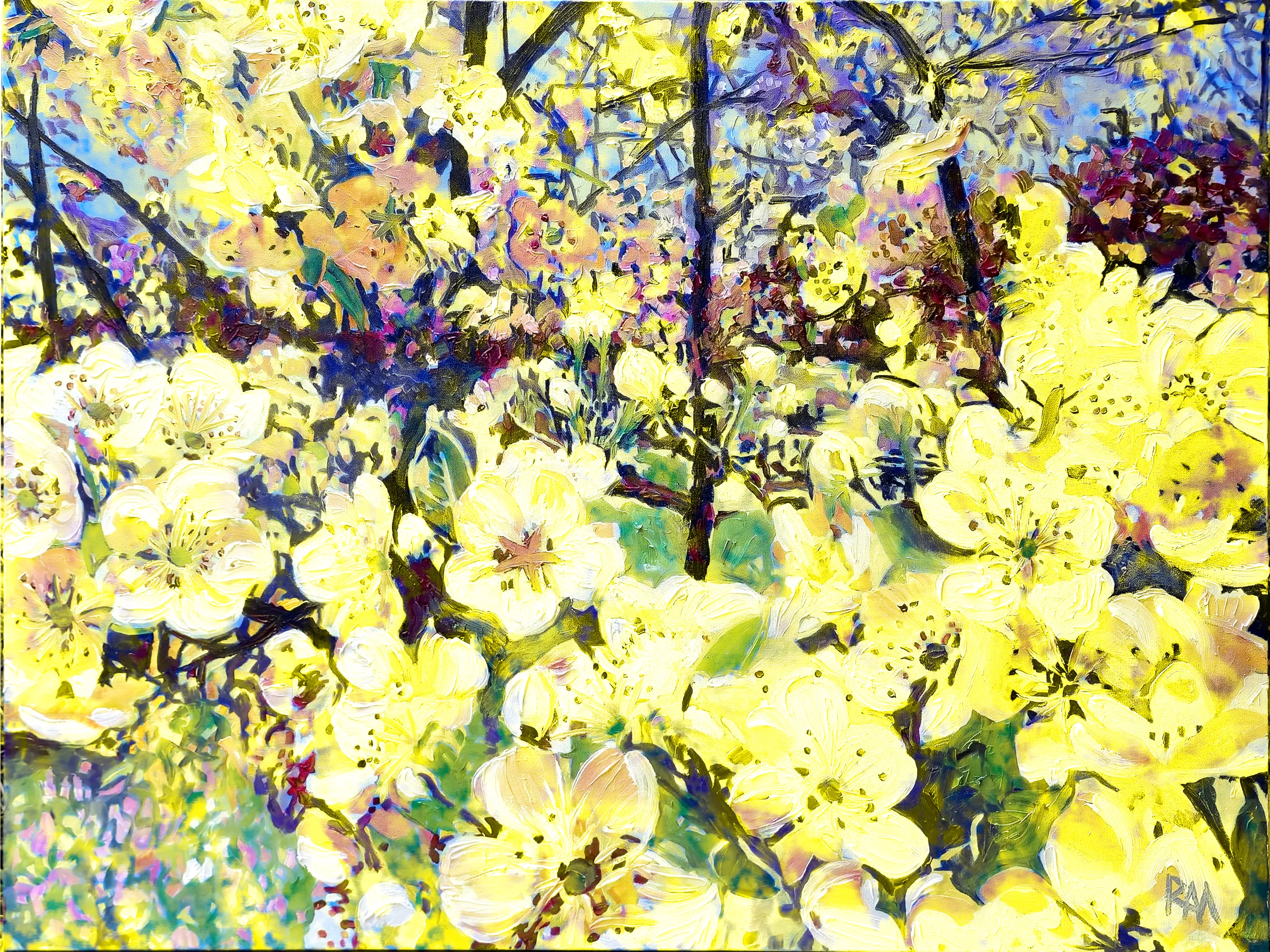 This is a Artwork in Yellow of Robert Mihaly?s original oil painting Bradford Pear Blossoms, 2025