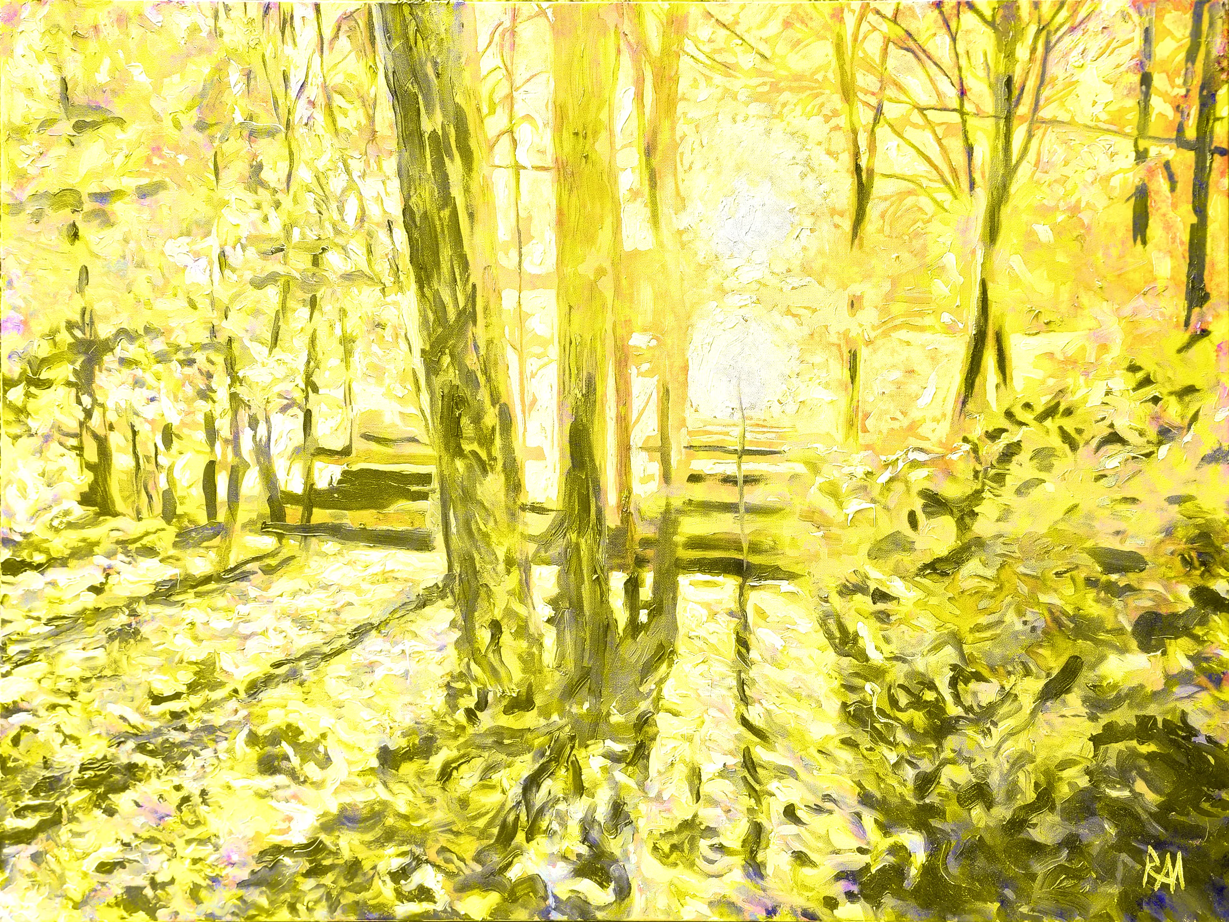 This is a Artwork in Yellow of Robert Mihaly?s original oil painting Canoe Racks at Sunset Lake, 2025