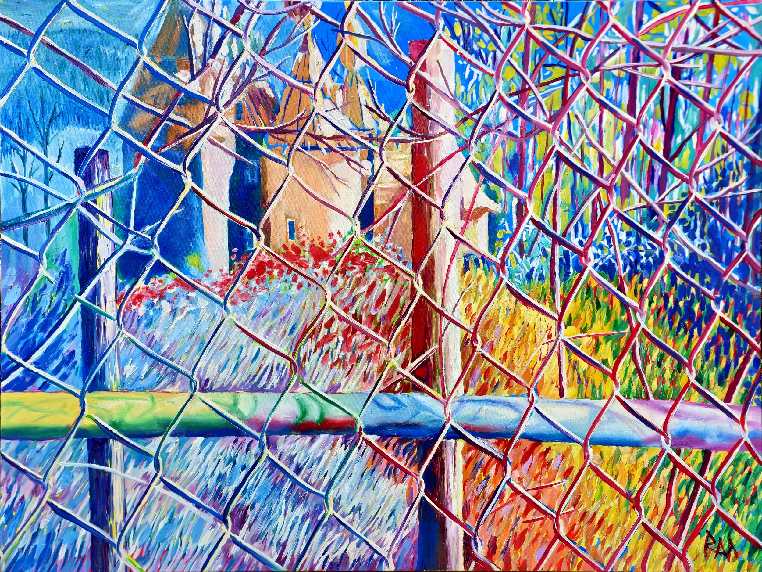 Castle Behind the Fence is a painting of paradox and persistence, a meditation on beauty caught in limbo. It depicts Castle Mont Rouge, vibrant and alive in its brilliant colors, rising proudly behind a twisted chain-link fence. The fence is not just a boundary?it is a symbol of the legal and personal battles that have enveloped the castle since late 2023. As Robert Mihaly fights to protect his creation from a dragon, the castle itself stands in suspension, a tangible testament to devotion and artistry in the face of adversity.