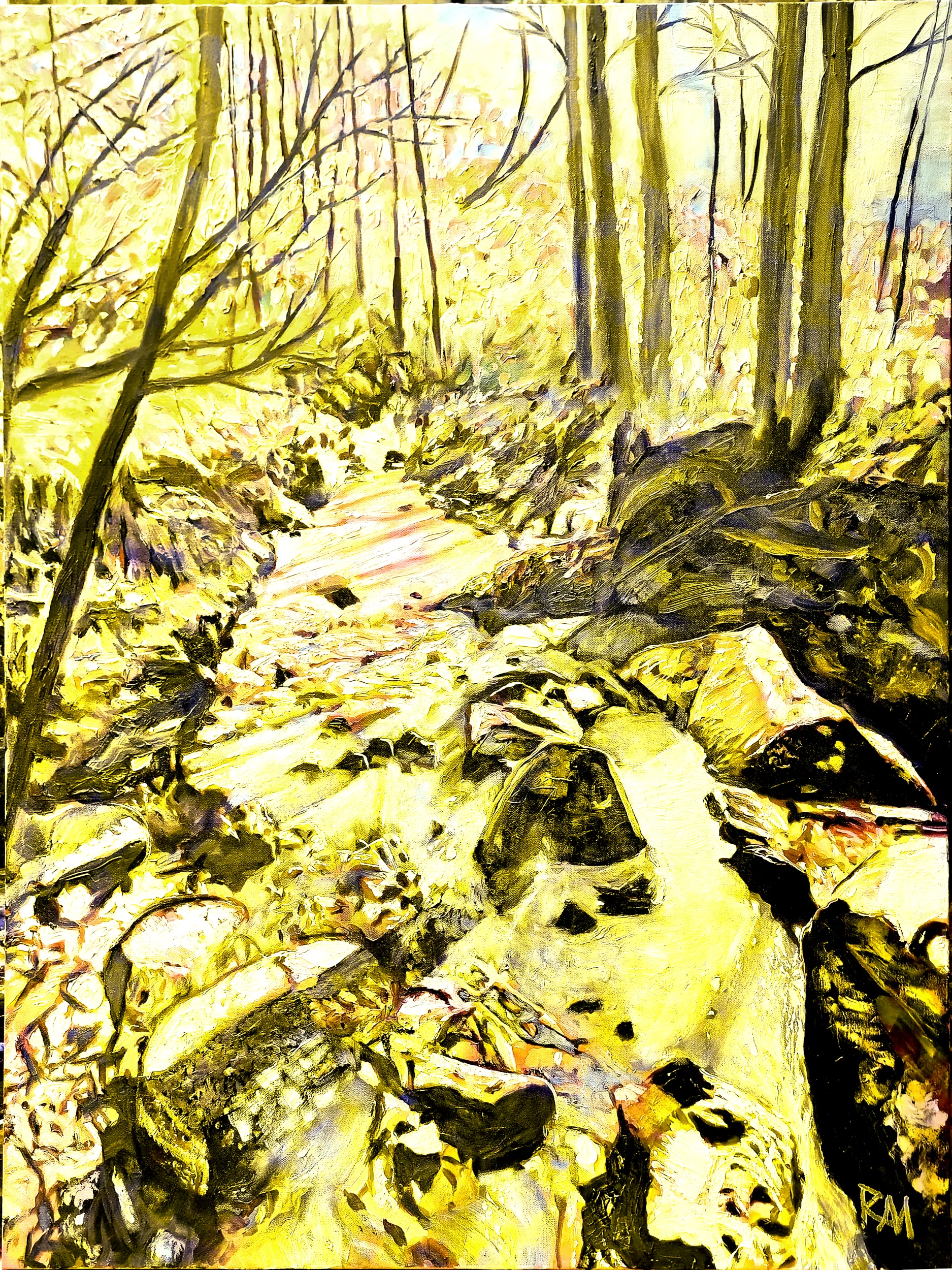 This is a Artwork in Yellow of Robert Mihaly?s oil painting Creek at Leasburg, 2024