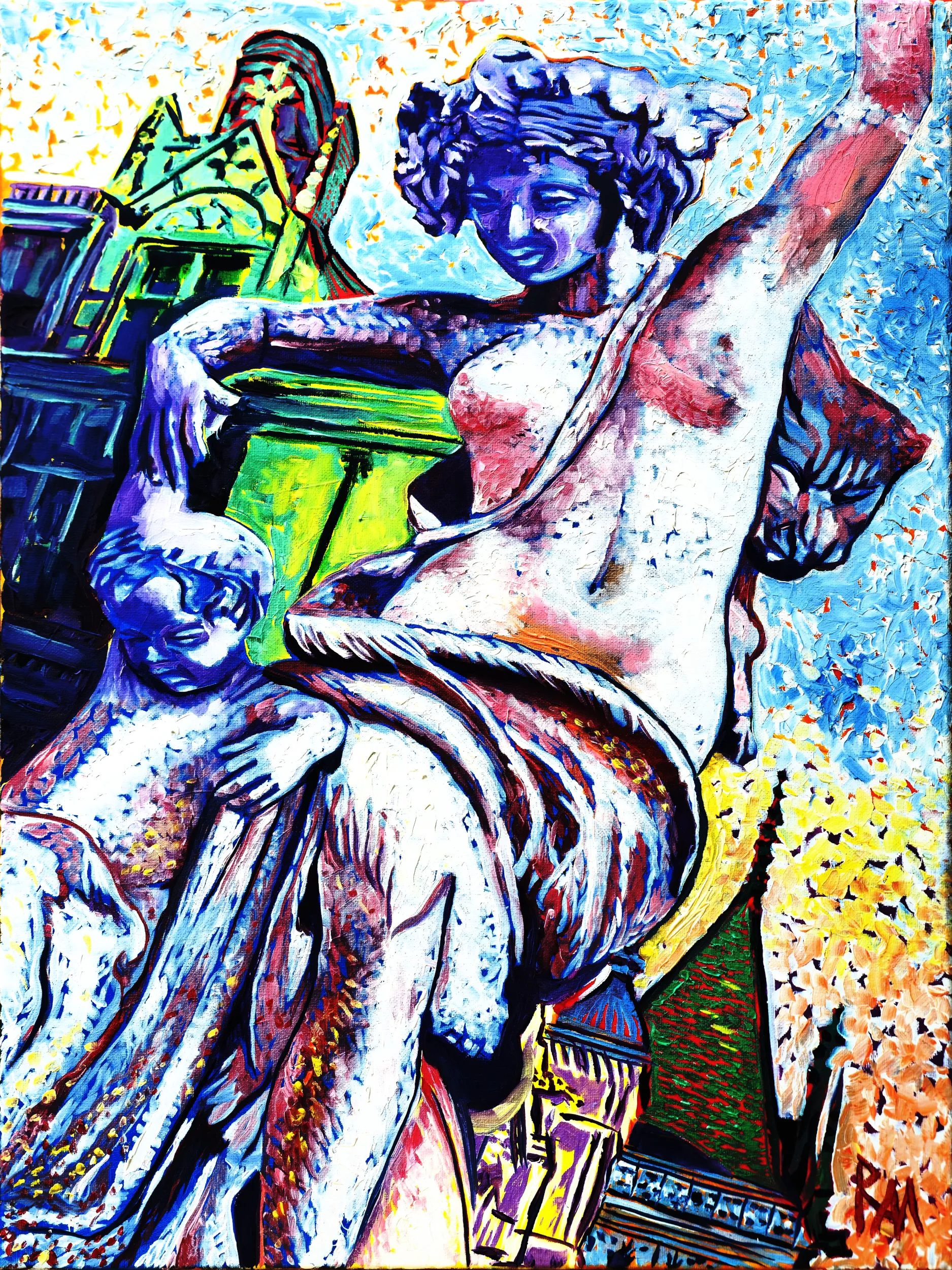 In this evocative rendition, the Italian white-marble sculpture The Dancing Lesson emerges from shadow and mystery, transformed by deep, brooding colors. The adult woman and toddler are bathed in dim, velvety hues of midnight blues, forest greens, and muted umbers, their forms hinted at by strokes of silvered moonlight that catch the curves and gestures of their dance. Mihaly?s bold, expressive brushwork intensifies the textures of the marble, making it feel both solid and ethereal, as if the figures are caught between dream and reality.