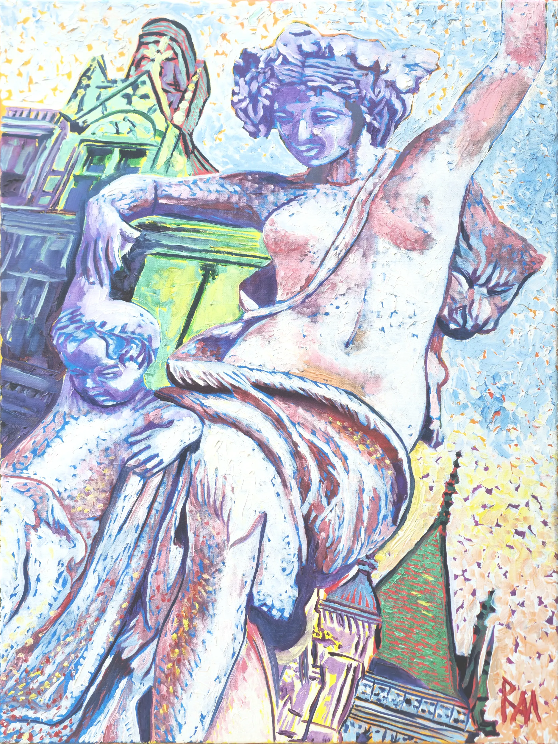 Mihaly?s impressionistic, loose brushwork allows color and light to mingle freely, giving the sculpture a sense of movement and life even within the calm pastel tones. Every detail?the raised arms of the dancing woman, the tiny footfalls of the child, the flutter of drapery?is rendered with tender precision, while the architectural backdrop whispers quietly, allowing the figures to remain the emotional heart of the painting.