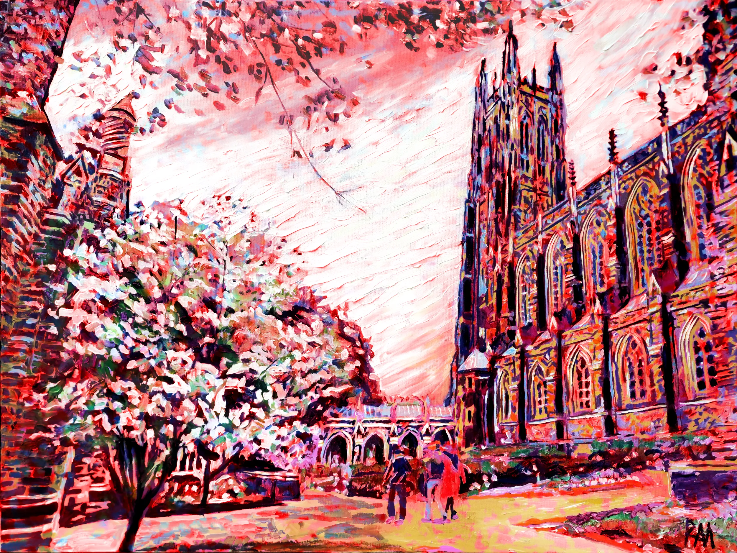 This is a Print Edition in Red of Robert Mihaly?s original oil painting Duke Chapel, 2024; in the Red Edition, Mihaly bathes the cathedral?s pinnacles, buttresses, and stained-glass windows in vibrant crimson, scarlet, and ruby tones, creating a bold, dramatic vision. The result is a scene filled with intensity, majesty, and architectural brilliance.