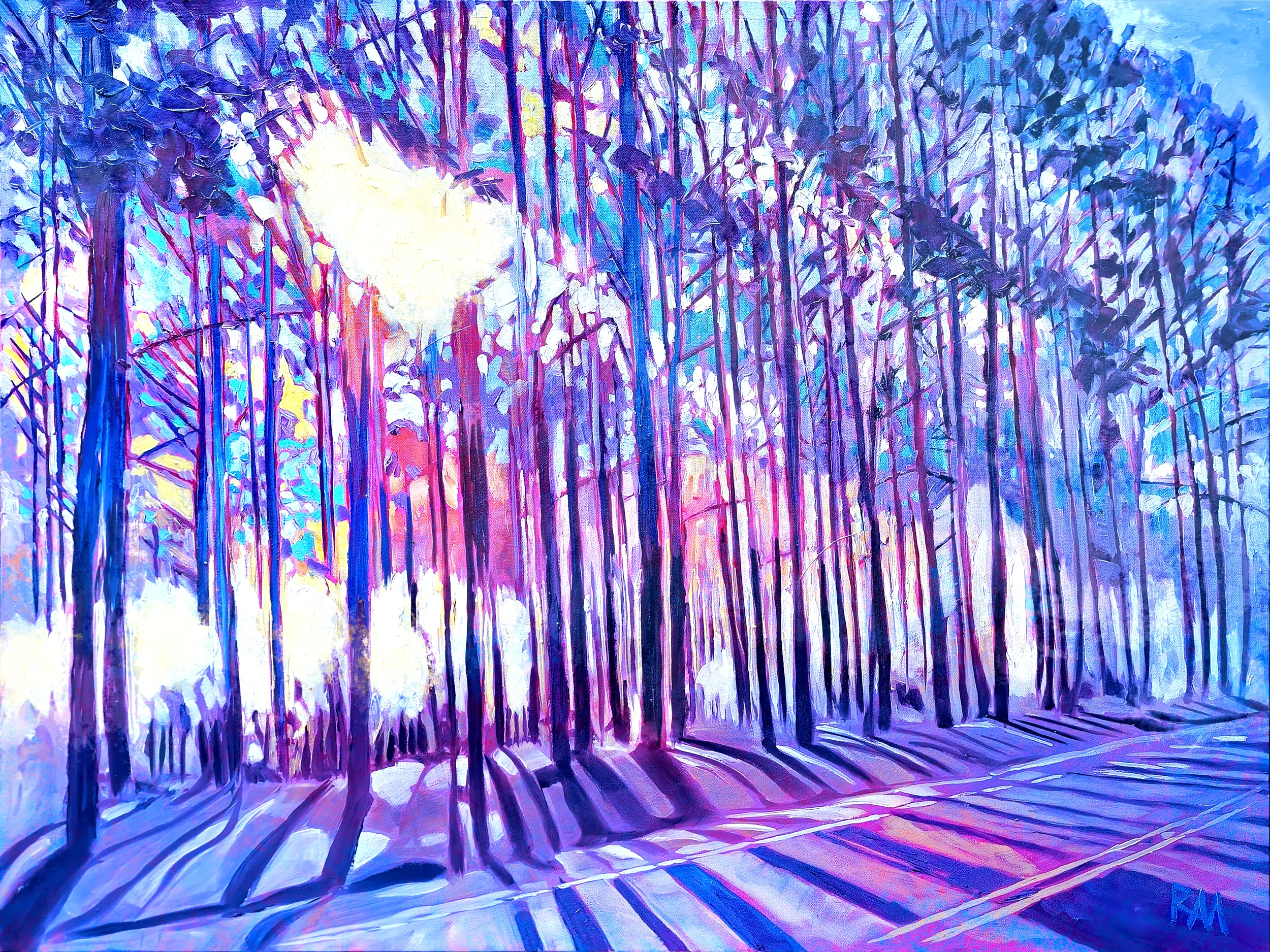 In the Blue Edition, Mihaly transforms Duke Forest into a woodland suffused with cool serenity and contemplative calm. Horizontal beams of light drift through the trees in soft gradients of cerulean, cobalt, indigo, and sky blue, turning the forest into a space of quiet reflection and expansive stillness. The scene evokes early morning or twilight, when the world is gently washed in the soothing tones of sky and water.