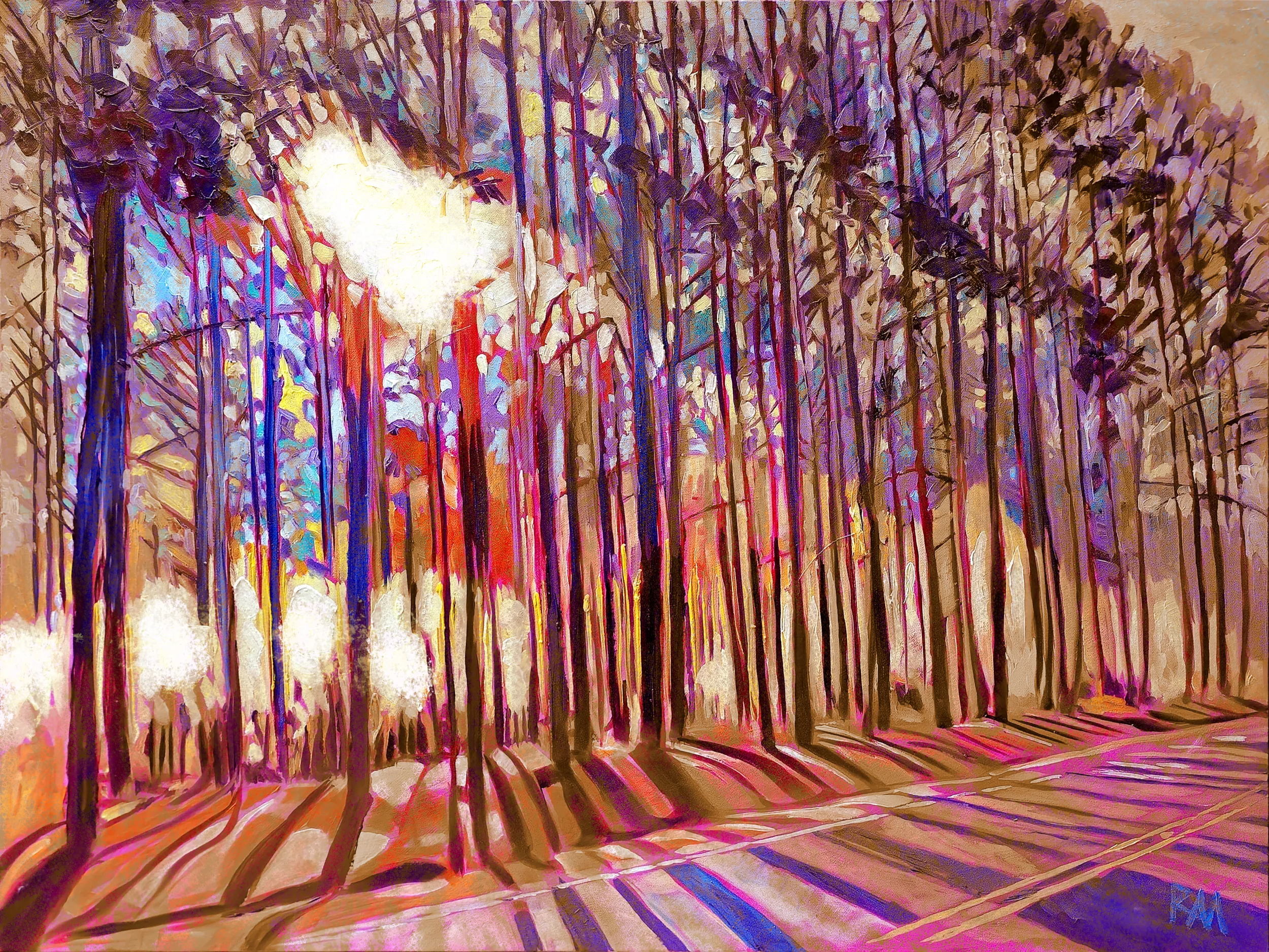 In the Brown Edition, Mihaly renders Duke Forest as a woodland rich with warmth, earthiness, and grounded serenity. Horizontal beams of light drift through the trees in tones of amber, caramel, chestnut, and warm sienna, transforming the forest into a sanctuary of natural depth and understated beauty. The palette emphasizes the tactile, enduring qualities of the woodland?its bark, soil, and fallen leaves?imbuing the scene with a sense of permanence and quiet strength.