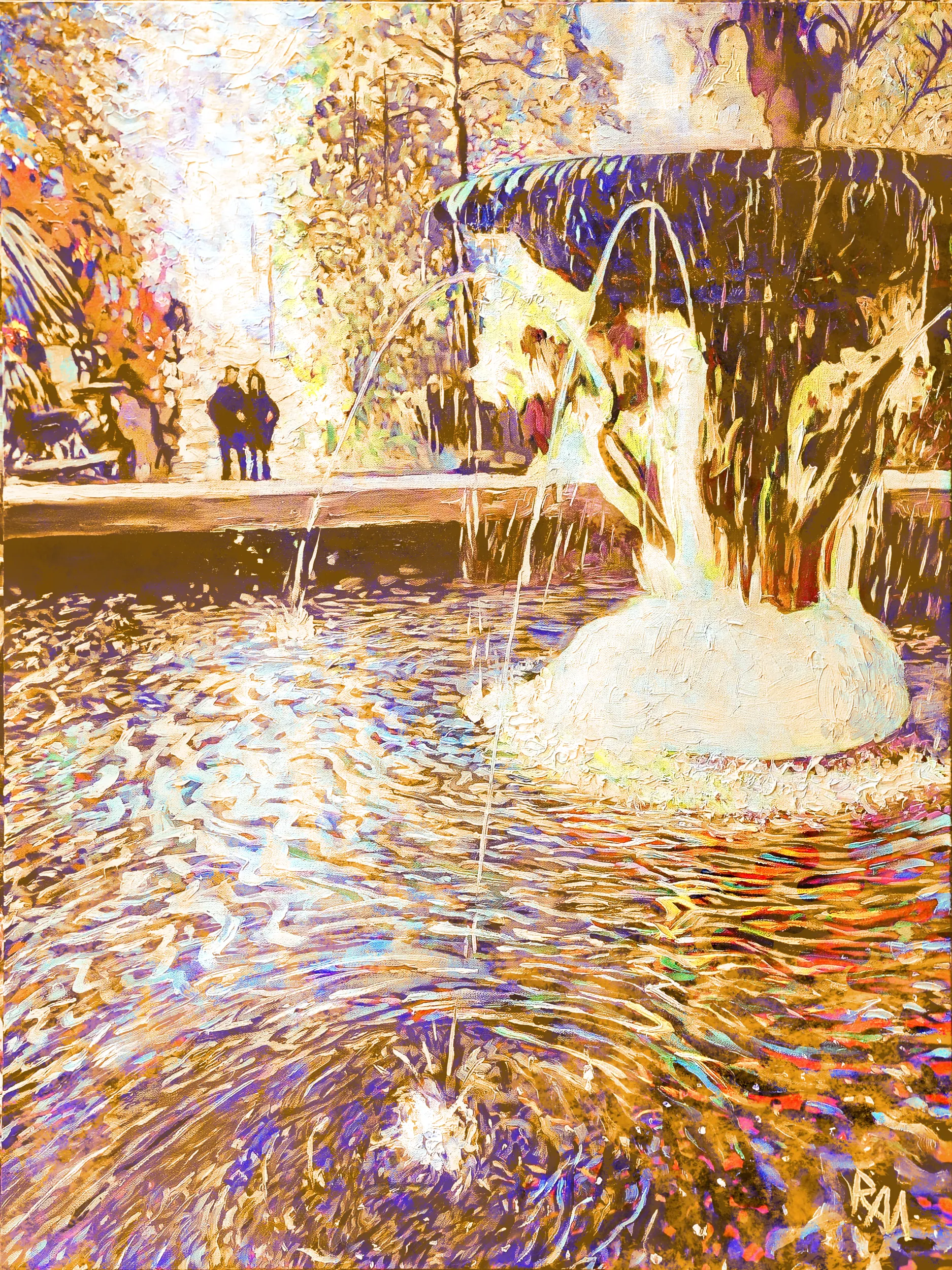 In the background, a small couple stands arm in arm, gazing at the fountain. Their presence, touched by the soft orange light, harmonizes with the warm tones of the fountain and surrounding foliage, evoking the quiet romance and intimacy of shared moments. The water glimmers with reflections of sky and tree, yet everything is tinted with a lively sunset-like palette that gives the painting a vivid, dreamlike intensity.