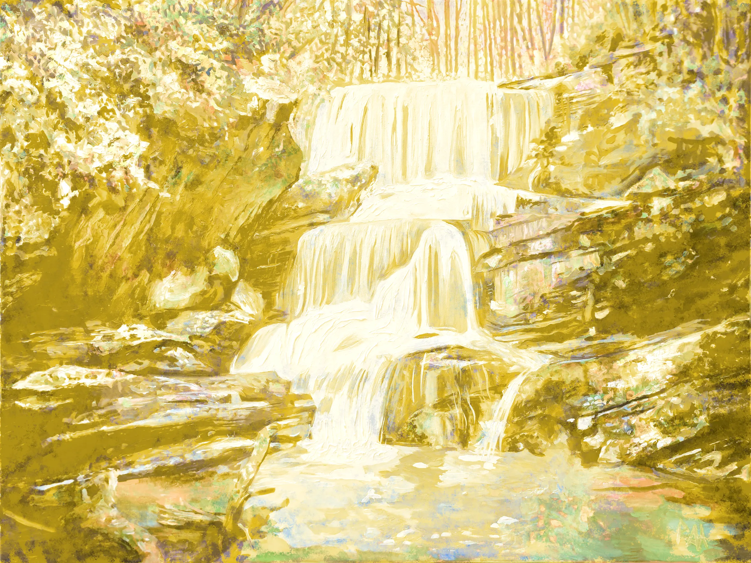 In the Cream Edition, Mihaly transforms the waterfall into a sanctuary of soft radiance?an Appalachian haven bathed in hues of ivory, buttercream, parchment gold, and the palest honeyed light. The cascade itself becomes a luminous veil, its tiers shimmering like silk as they spill over warm-toned rock. Without the cool drama of blue or the tension of shadow, the waterfall here glows with a gentle, sun-washed serenity.