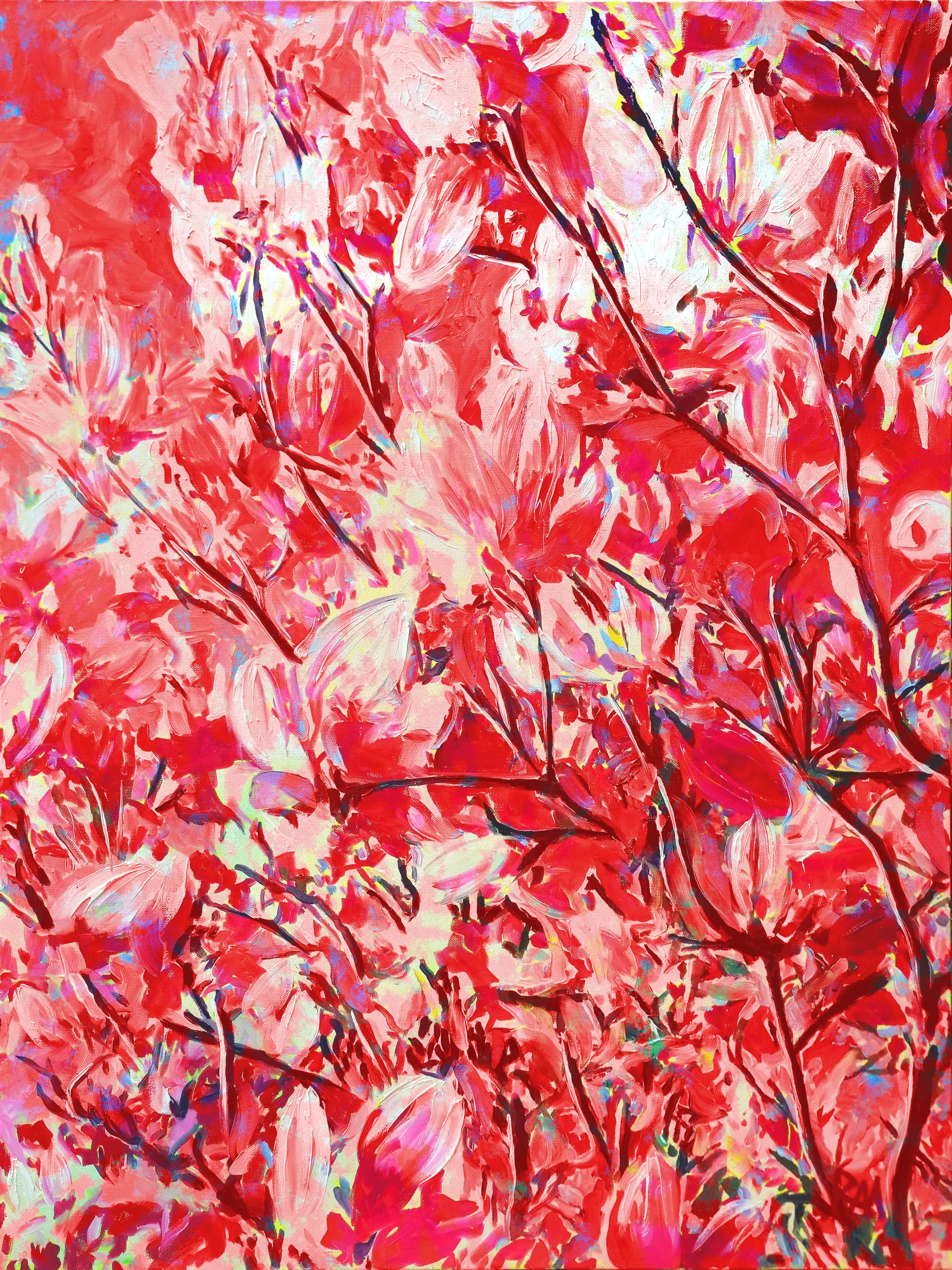Magnolia Blossoms Red Edition bathes the blooms in layered reds from scarlet to deep ruby, creating a kaleidoscopic, energetic vision that celebrates the passionate beauty and dynamic elegance of Mihaly?s composition.
