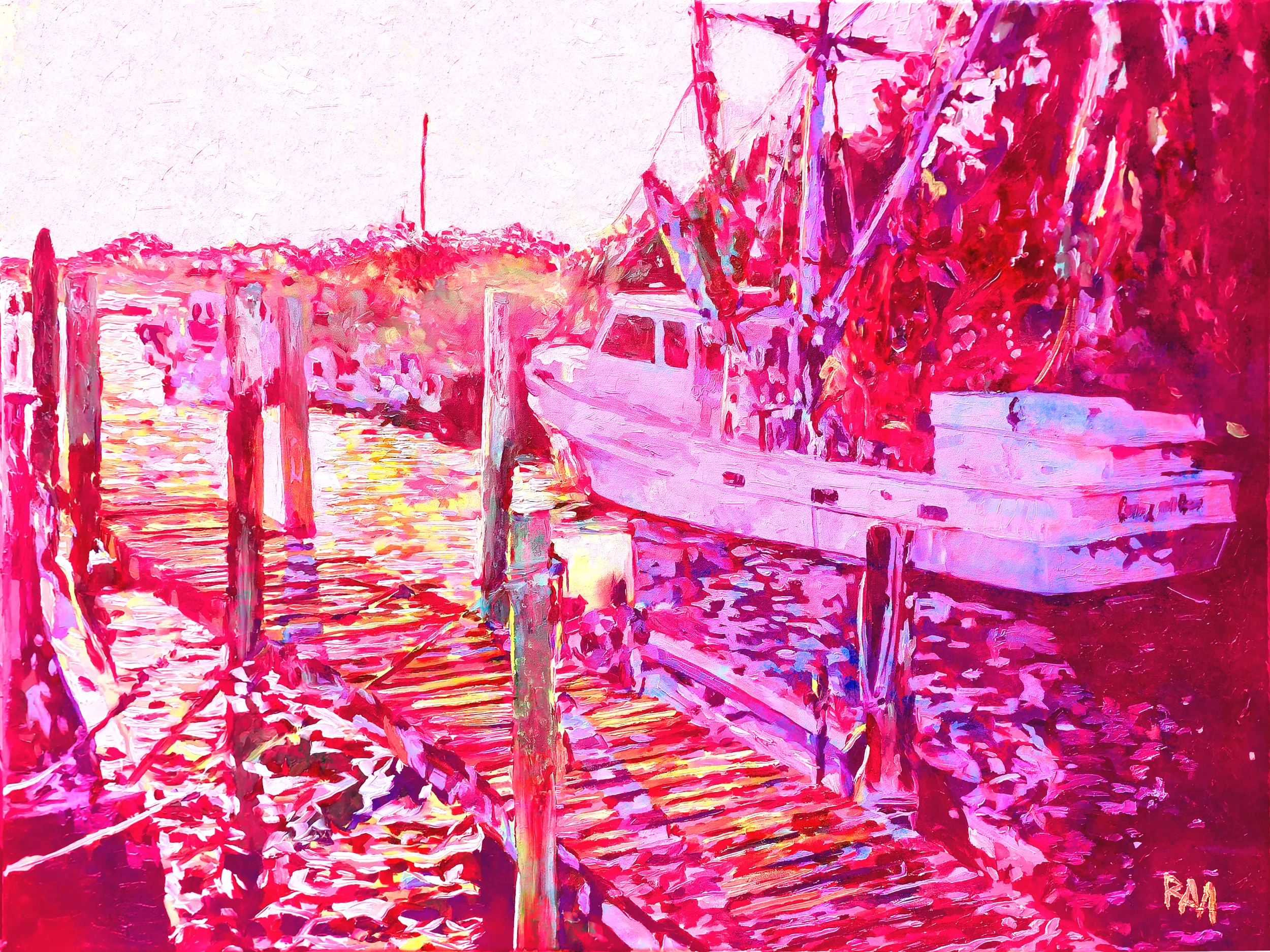 This is a Artwork in Pink of Robert Mihaly?s original oil painting Marshallberg Fishing Boats, 2024