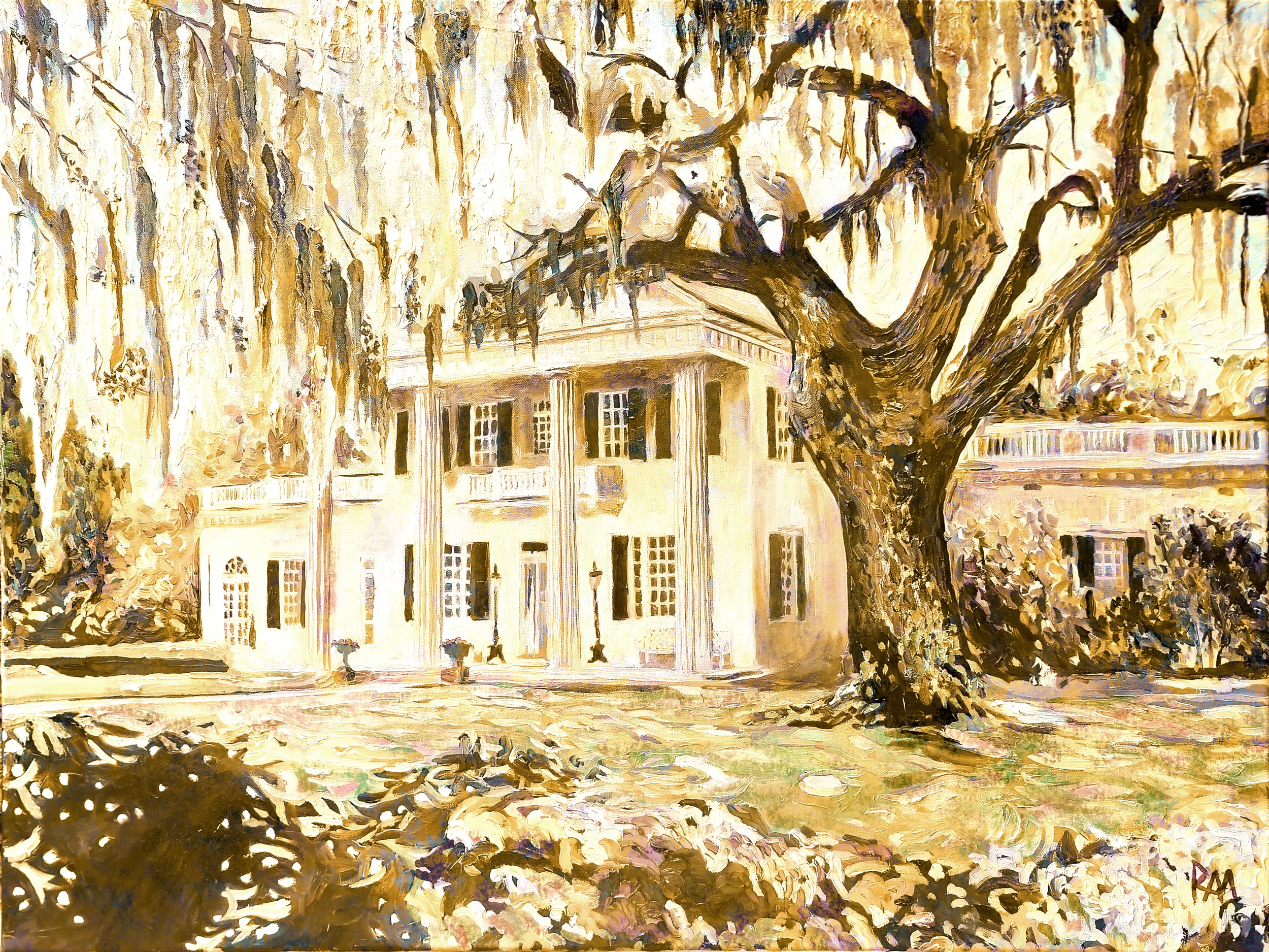 Mihaly?s expressive brushwork gives life to both the built and natural elements of the estate, emphasizing subtle textures and forms. Horizontal beams of light drift across the gardens and mansion like floating veils, creating a sense of calm and quiet reverie. The Cream Colors Edition evokes the poetic elegance of Orton Plantation, inviting viewers to linger in a space where history, beauty, and memory intertwine. The softness of the palette enhances the reflective quality of the scene, emphasizing the tender balance between human design and the living landscape of moss-draped trees, flowering gardens, and the tranquil river.