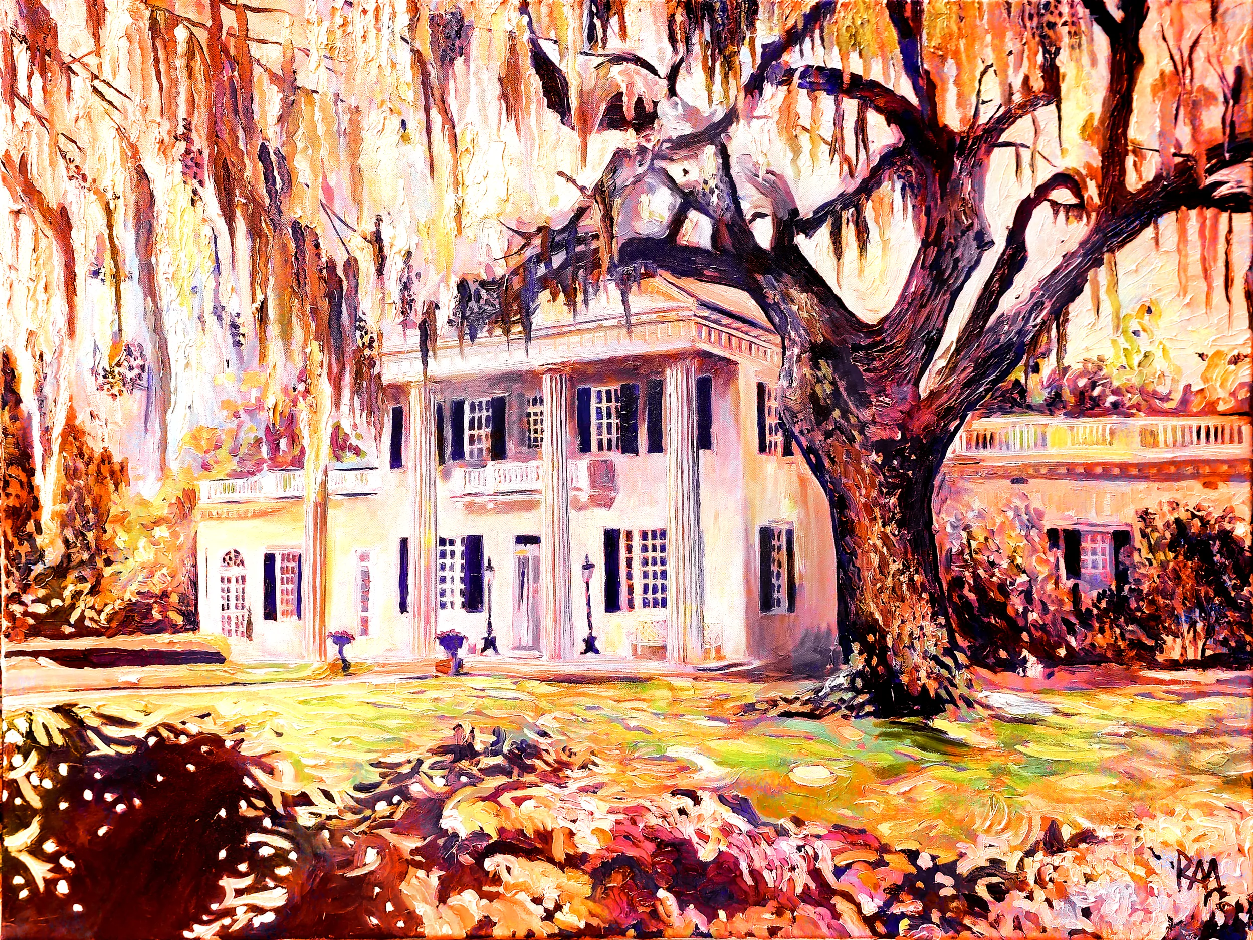 Mihaly?s expressive brushwork captures both the solidity of the plantation?s architecture and the ephemeral beauty of the surrounding landscape. Shadows stretch in deep ochre and russet, contrasting with luminous bands of orange that slice horizontally through the sky and river, guiding the viewer?s eye across the scene. The Orange Edition evokes feelings of warmth, nostalgia, and quiet grandeur, highlighting the plantation?s poetic Southern character while celebrating the interplay of light, color, and memory.