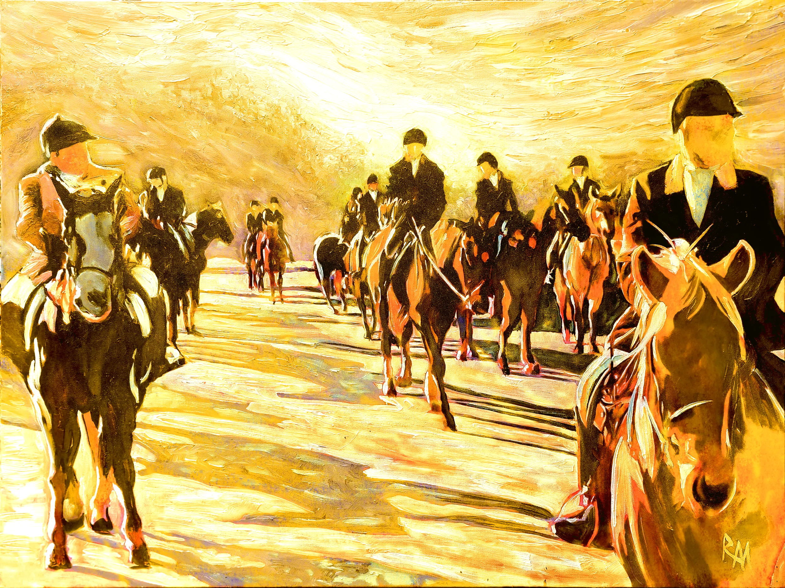 Mihaly?s brush captures this blend of motion and stillness, rendering the disciplined trot of horse and rider in luminous yellows and soft golds. Sunlight filters across the landscape, striking the horses? muscles, the folds of coats, and the dew on the grass, creating a scene both ceremonial and intimate. Each figure is carefully placed, conveying ritual, tradition, and anticipation. Trees on the horizon, brushed with amber and honey, echo the warmth of the morning, while shadows deepen the sense of texture and distance.