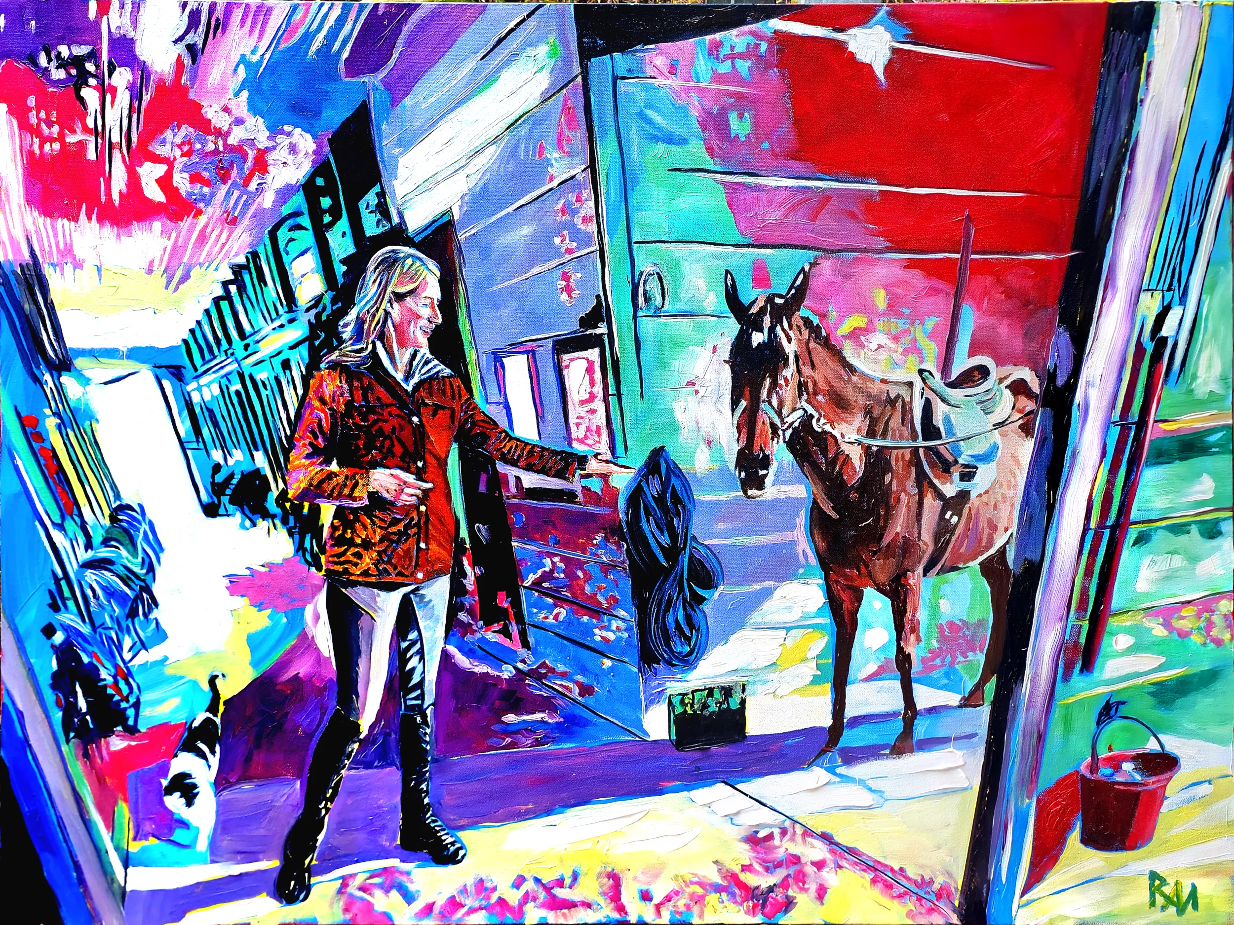 Mihaly?s expressive, bold brushwork emphasizes contrasts between light and darkness, turning the ordinary stable into a place of intrigue and narrative tension. The Dark & Moody palette evokes both the history of Quail Roost and the timeless, almost cinematic connection between humans and animals within these walls, just a short walk from the enigmatic Castle Mont Rouge. The painting conveys a sense of quiet suspense, the kind of secret only a horse named Secret could hold.