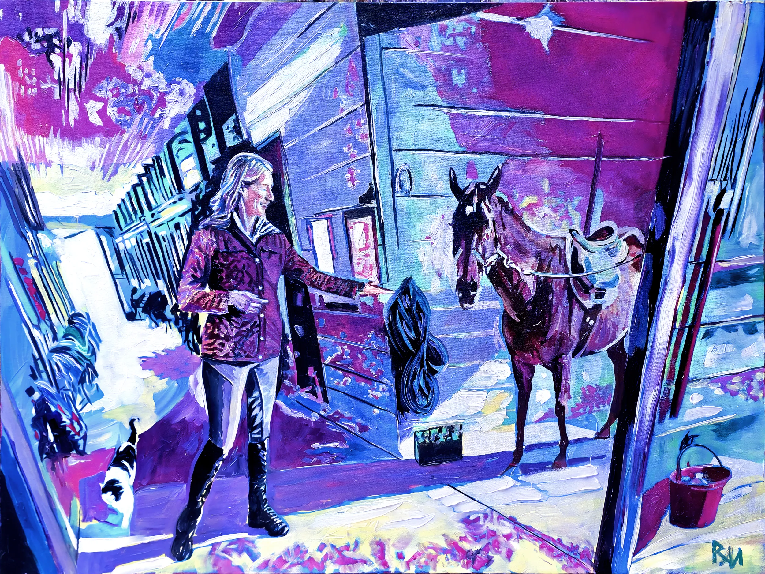 At the heart of the composition stands Secret, the so-named horse who gives this painting its title. Draped in a saddle and attentive to the viewer, Secret?s deep gaze conveys both intelligence and a hint of mischief. A black-and-white cat strolls into the vignette, adding an element of domestic whimsy, while an equestrian offers Secret a treat, a moment of quiet connection captured in Mihaly?s expressive, impressionistic brushwork. The hanging bucket of feed, the coiled rope, and the long play of shadow and light transform what could be a simple scene into a poetic study of equine presence, human care, and the luminous beauty of everyday moments.