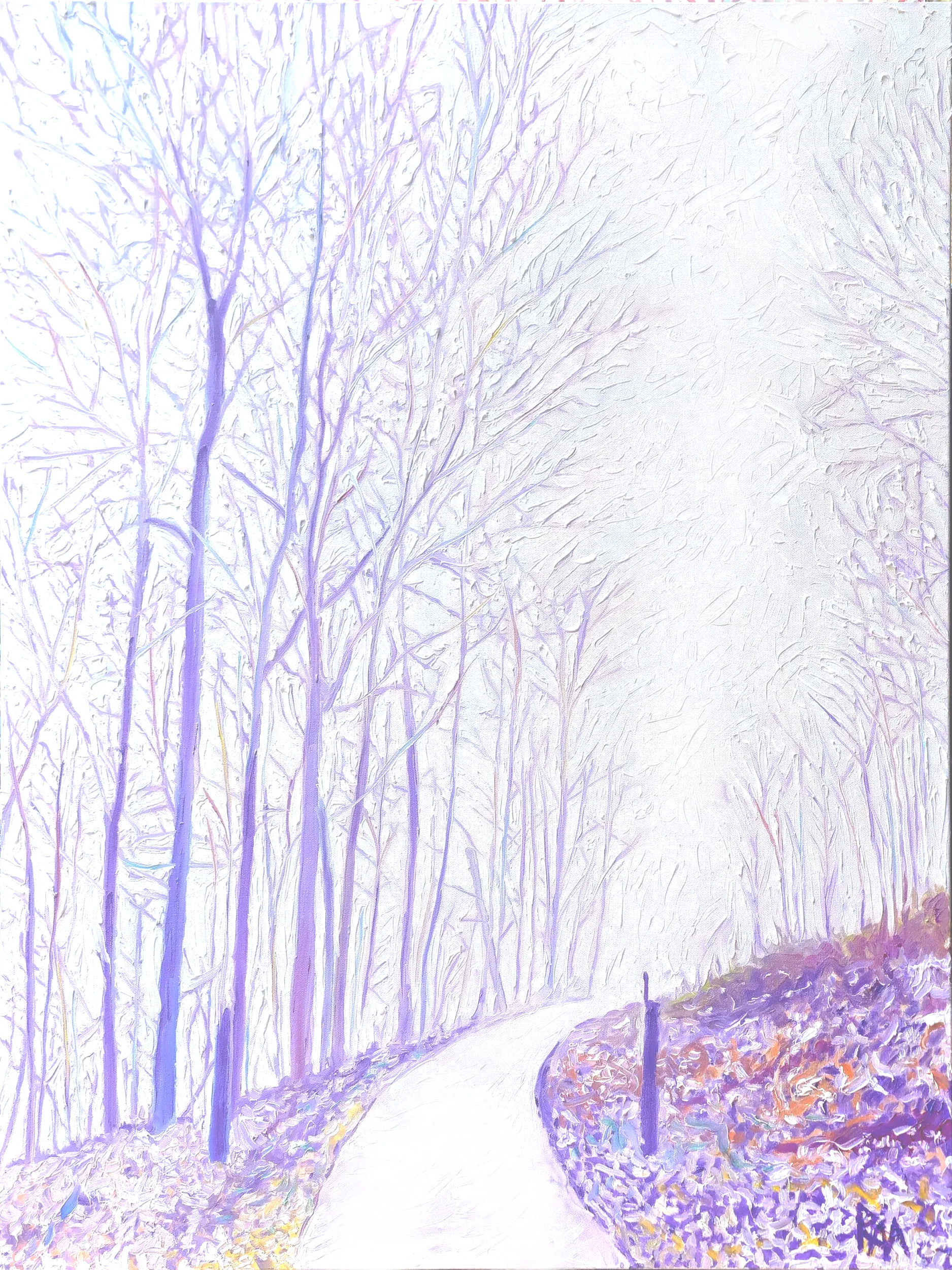 The curved road draws the viewer inward, evoking a sense of journey, anticipation, and wonder. Each twist of the path suggests a step closer to the castle, blending the tangible reality of the forest and mountain with a subtle air of enchantment. The pastel colors lend a softness and intimacy to the scene, transforming the winter landscape into a poetic, serene vision of a world caught between memory and imagination.