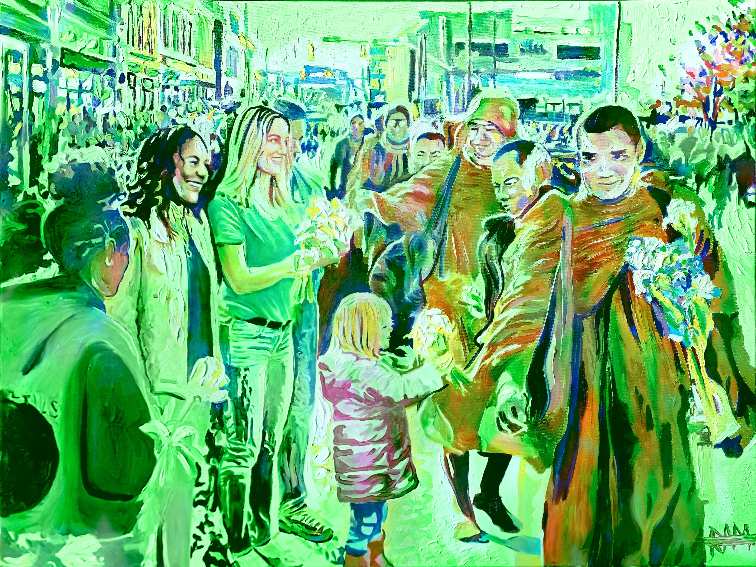 Mihaly’s brushwork emphasizes organic transitions while maintaining clarity of form. Color carries the scene, allowing architecture, crowd, and figures to coexist without hierarchy. Light moves confidently across surfaces, reinforcing vitality rather than calm.