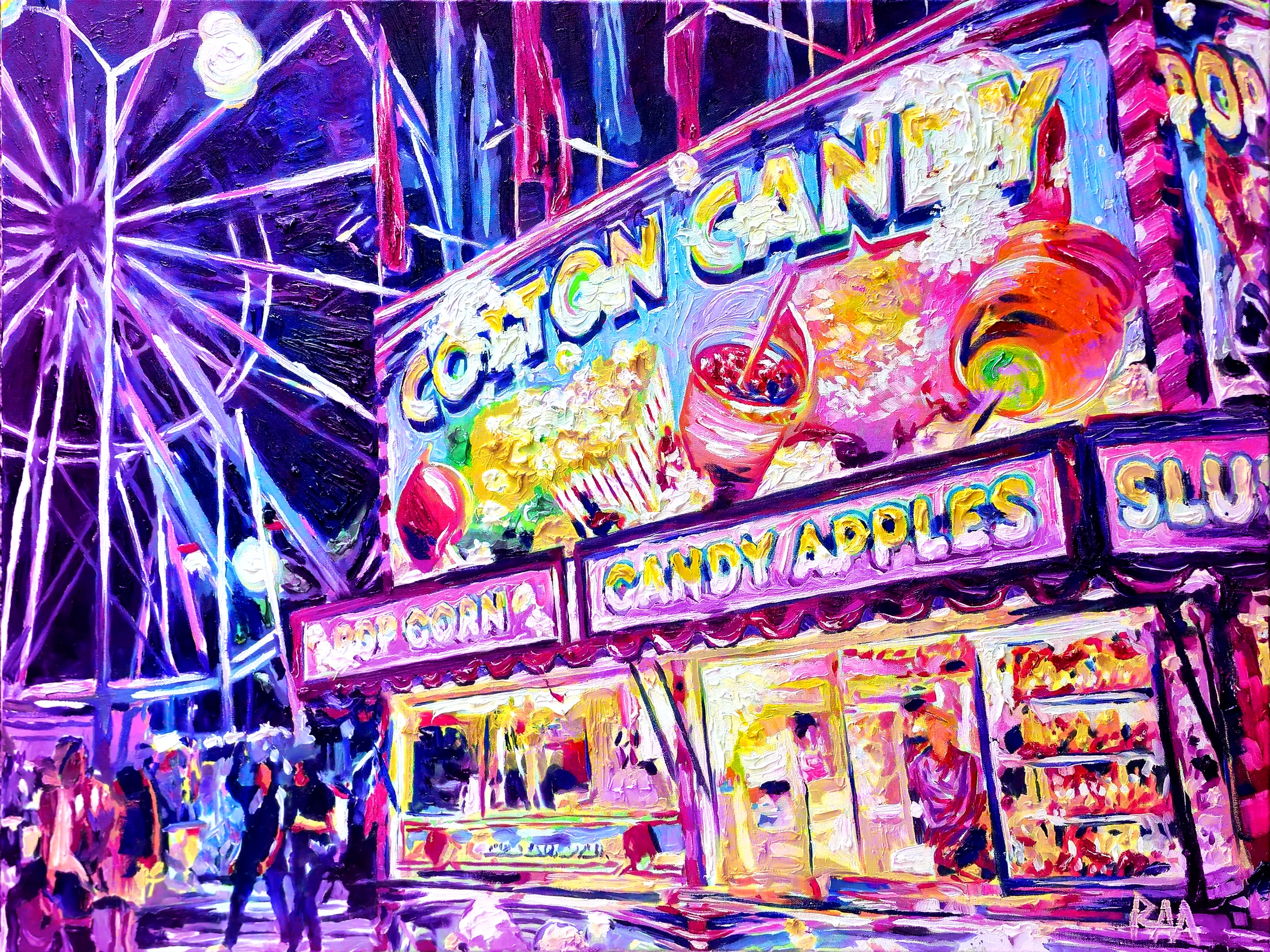 The ferris wheel rises in luminous arcs of purple-tinted bulbs, spinning slowly against the indigo sky, each spoke glowing with amethyst brilliance. The concession stand radiates soft lavender warmth?cotton candy becomes swirling rose-lilac clouds, slushies glint with icy violet highlights, and candy apples reflect deep plum light. Crowds drift through the scene in gentle silhouettes, touched by subtle orchid and aubergine reflections that glow across their forms. Mihaly?s expressive brushwork enhances this twilight atmosphere: lights blur into halos, shadows deepen into velvety tones, and every movement feels wrapped in dreamy, nocturnal color.