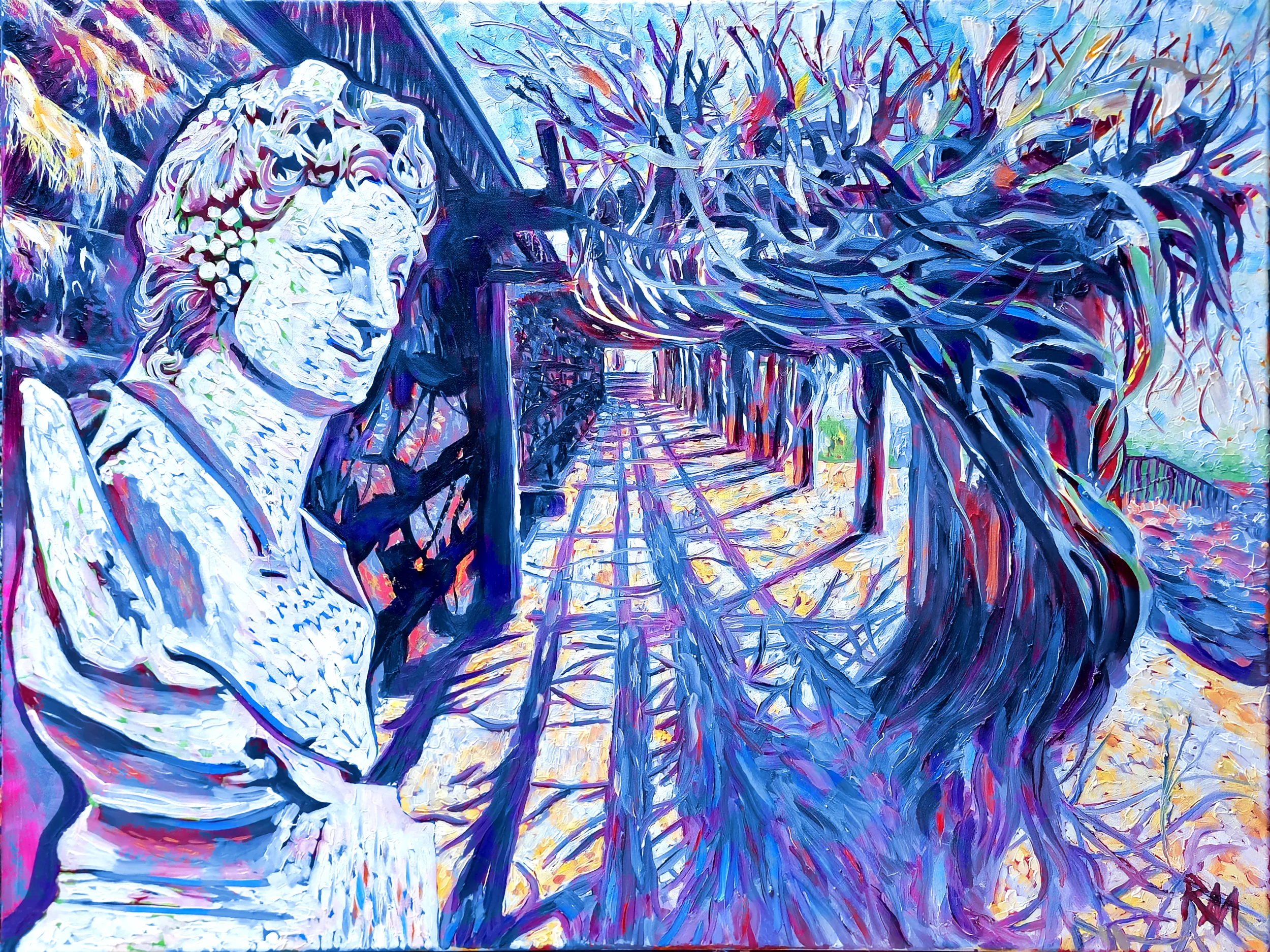 The rich, layered blues evoke the mystery of twilight skies, the quiet depth of shaded leaves, and the contemplative calm of a secret garden. Mihaly?s brushwork, bold yet fluid, imbues the trellis with a life of its own, a subtle energy that pulses through each vine and column. In this edition, the Trellis Walkway becomes a sanctuary of reflection and wonder, a serene corridor where stone, wood, and nature meet in an intricate dance of line, light, and hue.