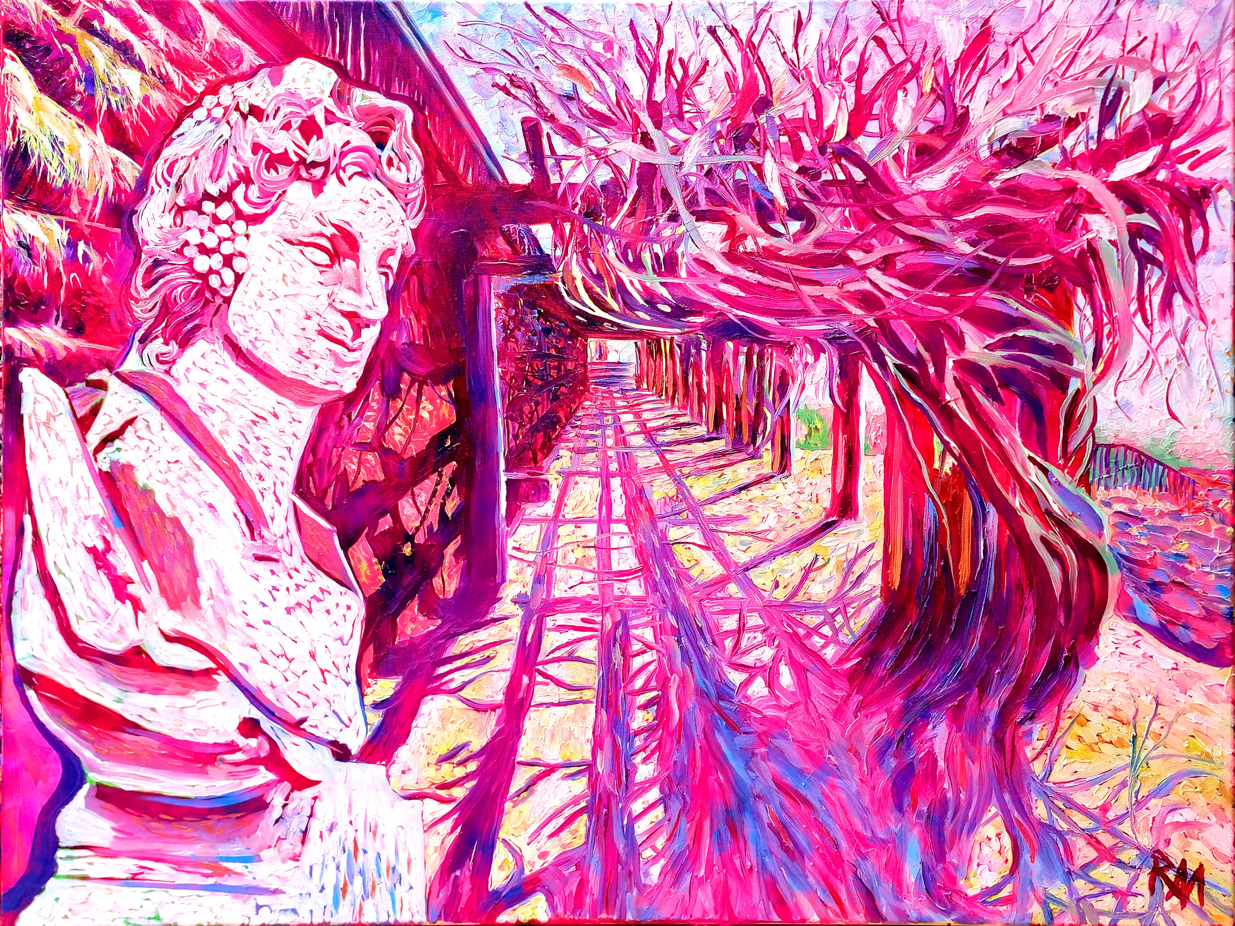 This is a Print Edition in Pink of Robert Mihaly?s original oil painting Trellis at Biltmore, 2024. Beneath the tangled canopy of curling vines, light and shadow weave along the pergola?s graceful columns, while a marble bust presides over the serene garden path, where nature and architecture entwine in whispered elegance.