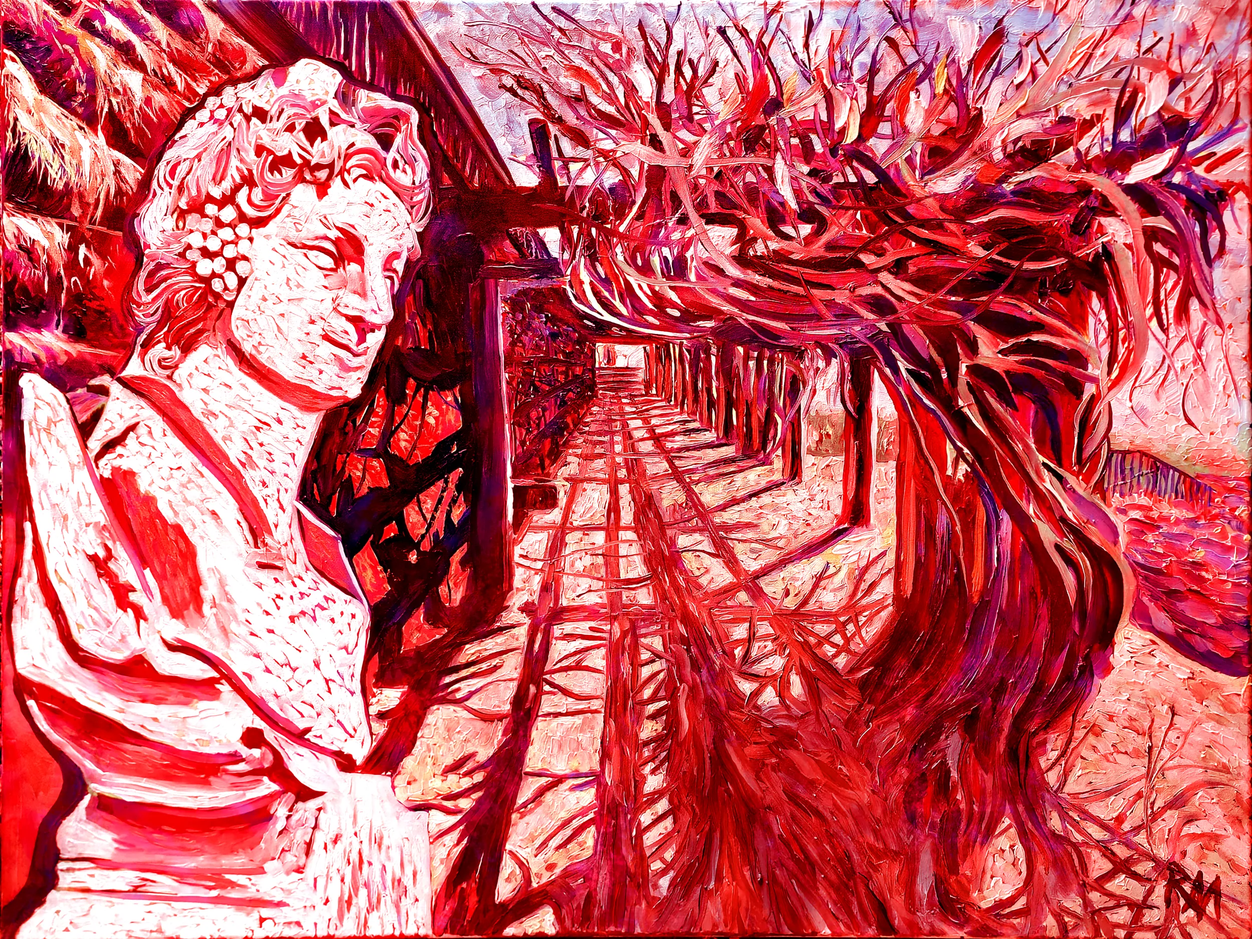 The pergola?s shadows and the dappled sunlight that filters through the climbing vines are rendered in energetic, sweeping strokes, emphasizing the rhythm and movement of the scene. Even within the warmth of the reds, there is a palpable sense of depth, drawing the viewer along the trellis path toward the distant conservatory.