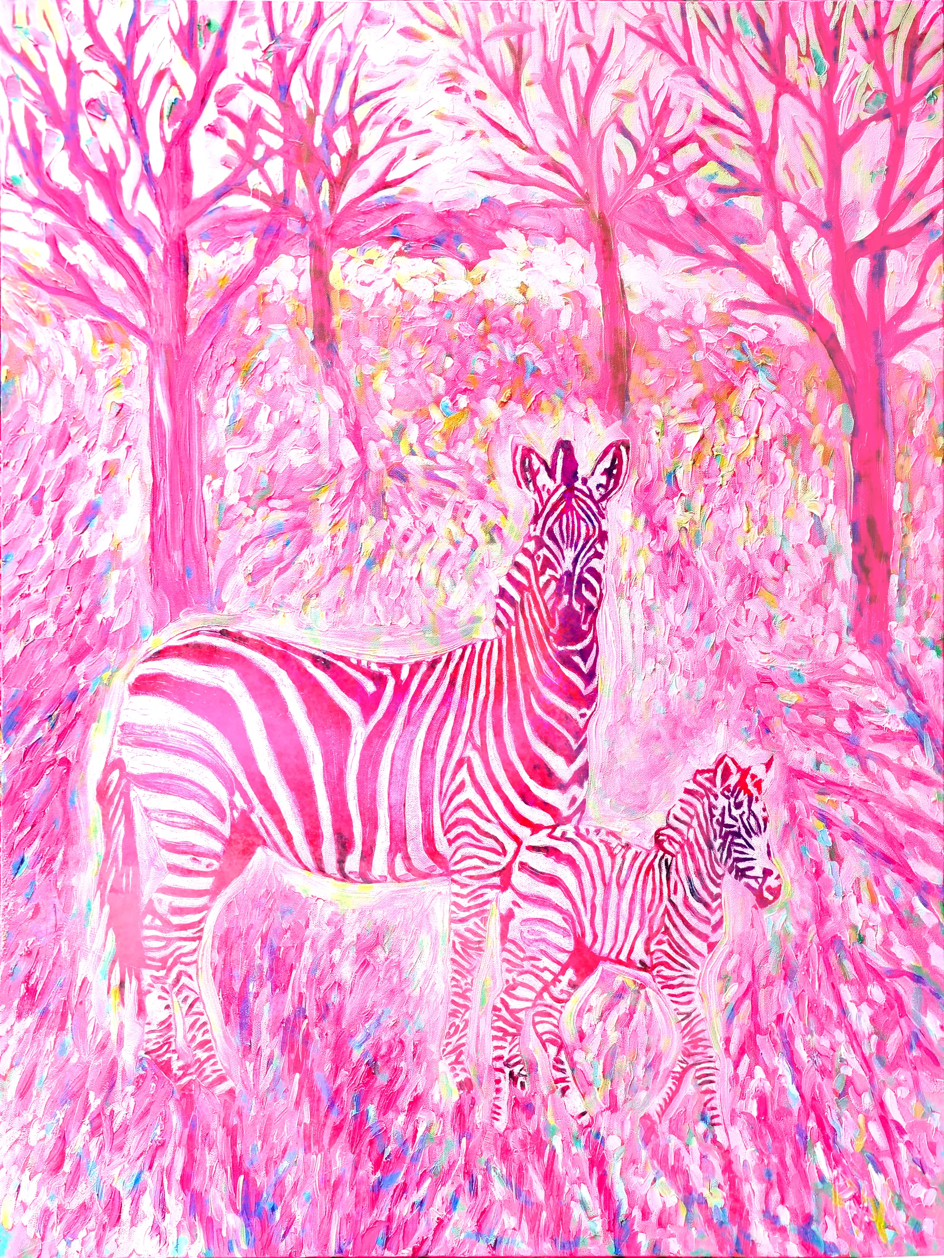 In this vibrant Pink Edition, Mihaly bathes baby Zora and her mother in shades of fuchsia, coral, rose, and blush, infusing the scene with warmth, energy, and playful joy. The zebras stand in a sunlit meadow, framed by trees and a sky brushed with bold, expressive colors, while the sunlight glimmers across the grass, creating a lively dance of contrast and shadow. Mihaly?s impressionistic brushwork emphasizes the textures of the zebras? stripes, the sway of the foliage, and the soft contours of the distant trees, giving the pastoral scene movement, vitality, and a radiant sense of life.